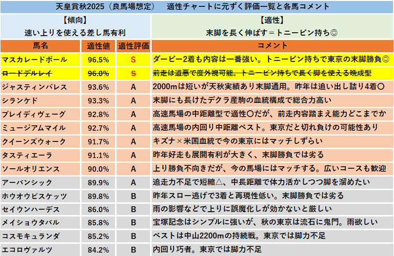 天皇賞秋では、後半の直線で持続的な末脚を発揮できるトニービンの血が活躍傾向。