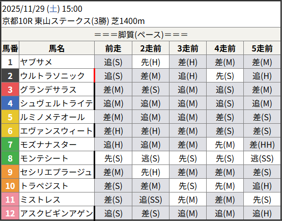 このレース、下段の表を見ていただくとわかりやすいと思うが、1400m戦としては逃げ・先行馬がかなり少ない組み合わせ。スローの前残りか、スローでも速い上がりを使える馬が上位だろうが、スローでも速い上がりを使える馬は多くない。となると、前に行く馬の方で8.モンテシートを狙いたい。3勝は全て1600m戦。1400m戦は3走前の橘Sの5着があるが、当時は前に行きながらも速い脚が使えず。ただ、出走していた馬は1400mで速い上がりを使っていたり、1200m戦を勝ってきた馬でより高い瞬発力(スプリント能力)を要求されるレースだった。今回も同様に瞬発力不足の可能性は残しつつも、成長も加味すると上位可能と見る。