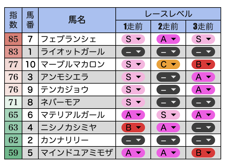 アンモシエラ・テンカジョウともに強いがしっかりオッズに反映されている現状で、オッズ的な妙味は薄い。むしろ58kgを背負わされての1600m戦というアンモシエラはスムーズに前に行けなかった際やなどにも不安はあり。テンカジョウも3着は問題ないとみるも、1600m戦では忙しい可能性もある。それならば実績十分ながら、取り消しやJRAのレースでの大敗で30倍近くオッズがもらえる模様のライオットガールに妙味あり。