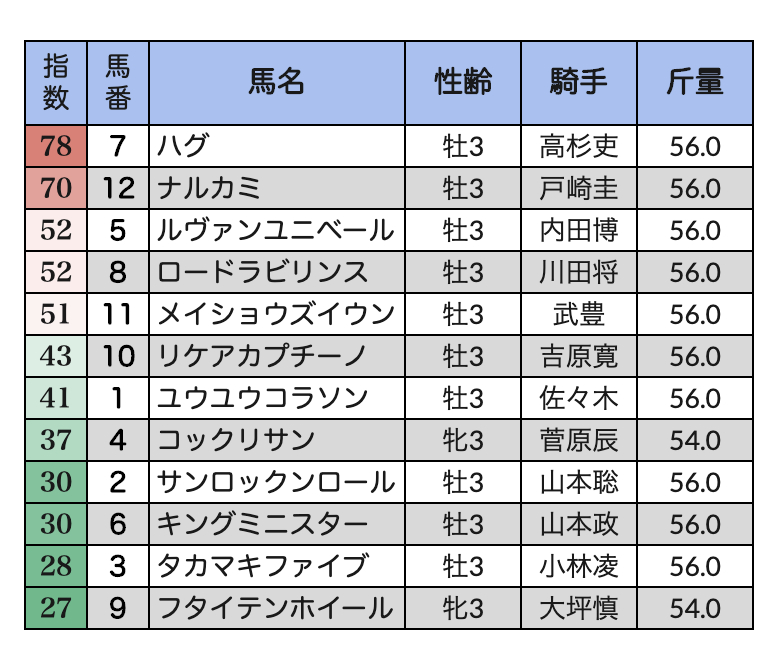 対抗ではレパードSで終始外外回る競馬で4着だったハグ。大外枠ゆえに前取りきれず終始外回る競馬になってしまったのは痛恨だったはずで、今回はすんなり前目の競馬が出来そうな枠。